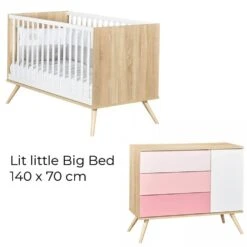 Lit bébé : Ce lit bébé Sauthon possède un sommier fabriqué en hêtre brut pour ses propriétés résistantes. Il est également réglable en hauteur sur 3 niveaux pour le confort des parents.