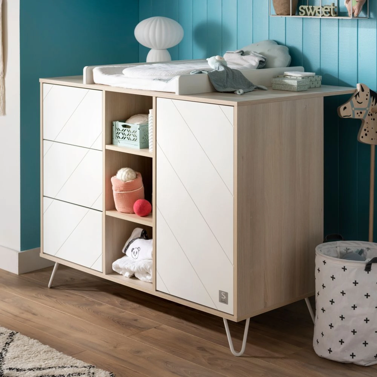 Commode : Cette commode possède des séparations verticales. Du côté porte, il y a 2 tablettes intérieures, les 3 niches comprennent également 2 tablettes . Le dessus a été fabriqué en panneaux de particules revêtus de papier décor Acacia clair. Pour utiliser la commode en toute sécurité, il est conseillé de la fixer au mur à l’aide de sangle (fournie). Votre petit bout pourra ranger toutes ses petites affaires dans cette jolie commode made in France !