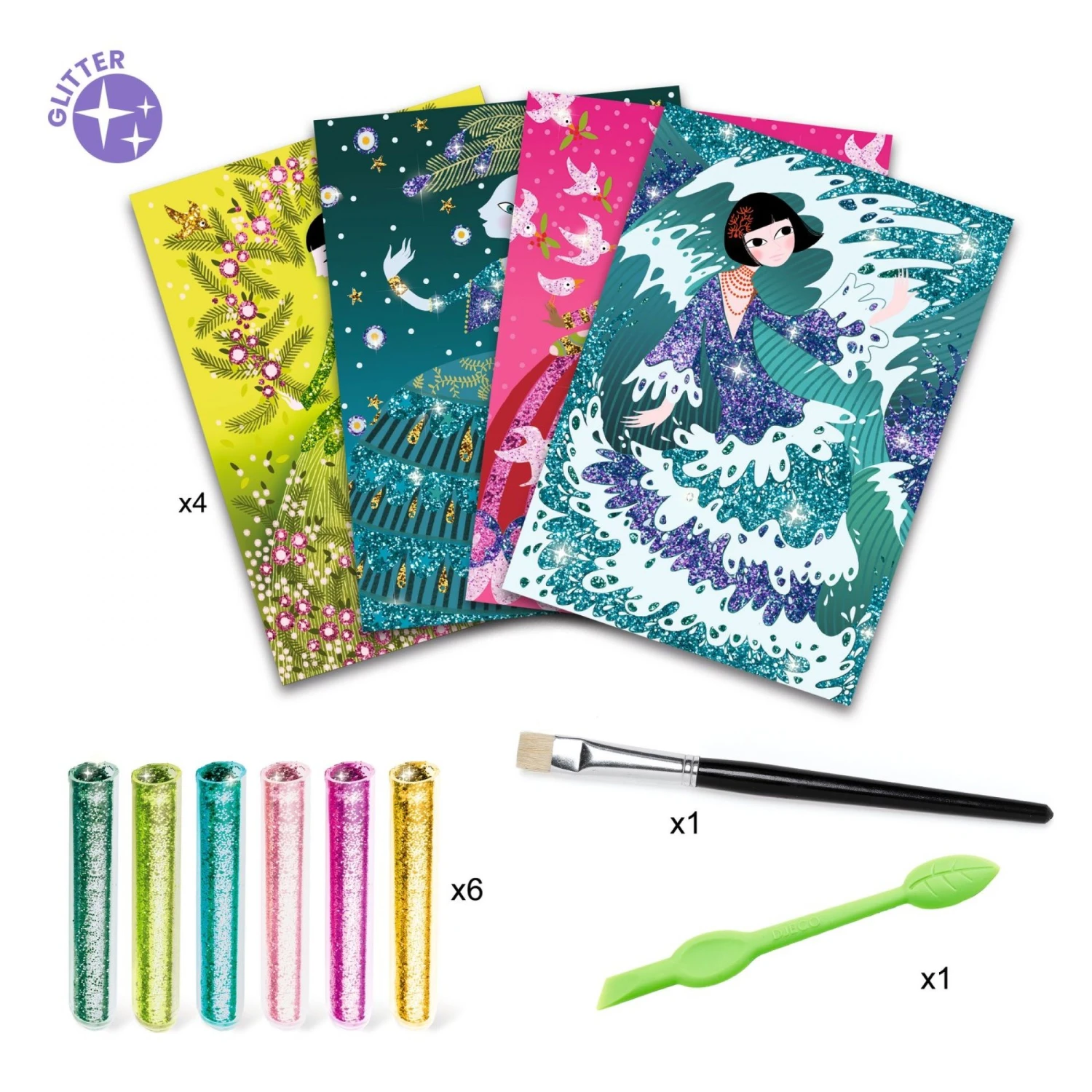 Contenu : 4 cartes encollées (15 x 21 cm), 6 pipettes de paillettes colorées, 1 outil pour dévoiler les parties encollées, 1 pinceau et 1 livret explicatif en couleur.