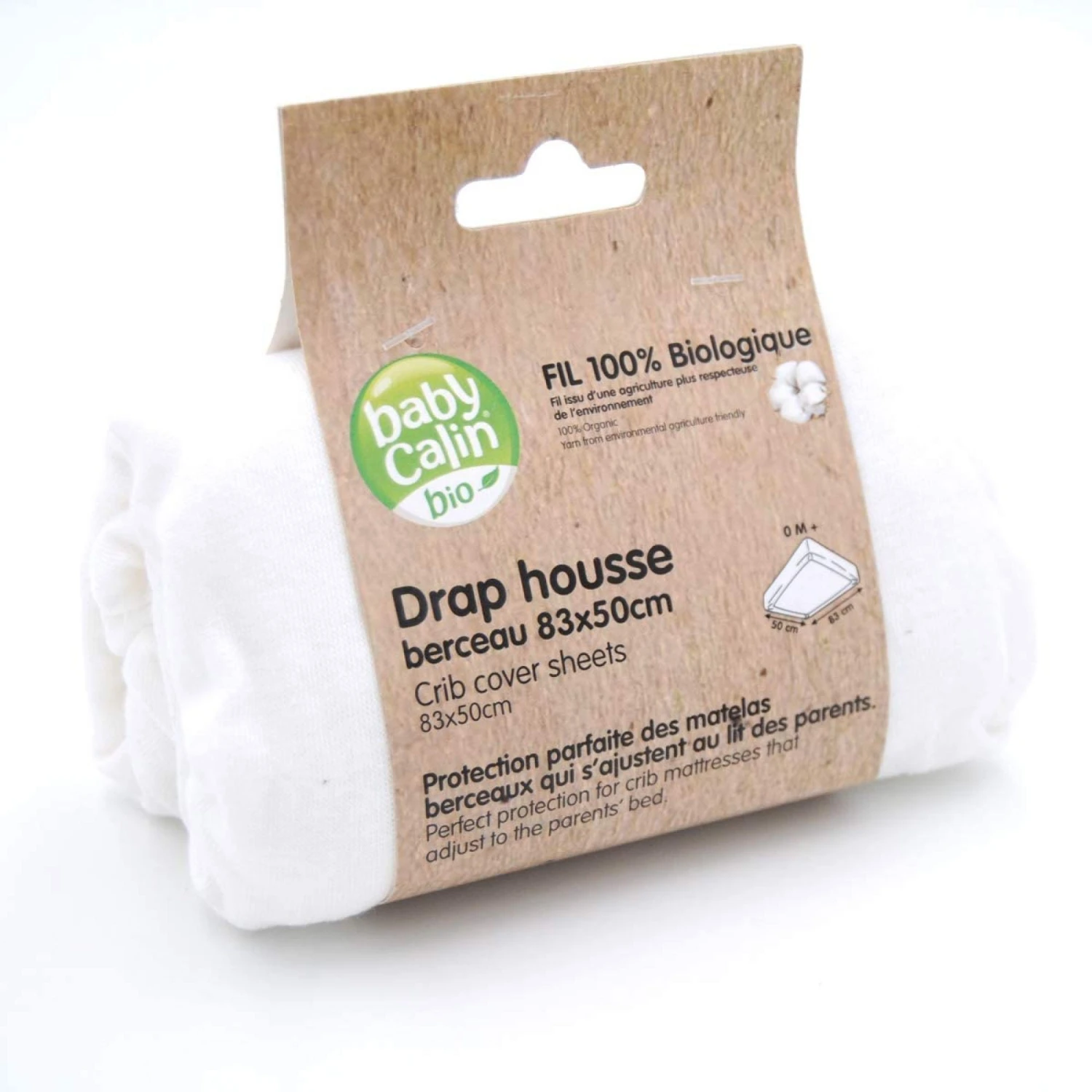Découvrez le drap housse en jersey bio 83×50 cm coloris blanc de la marque Babycalin. Doux et résistant au lavage, il protègera parfaitement le matelas de votre enfant.