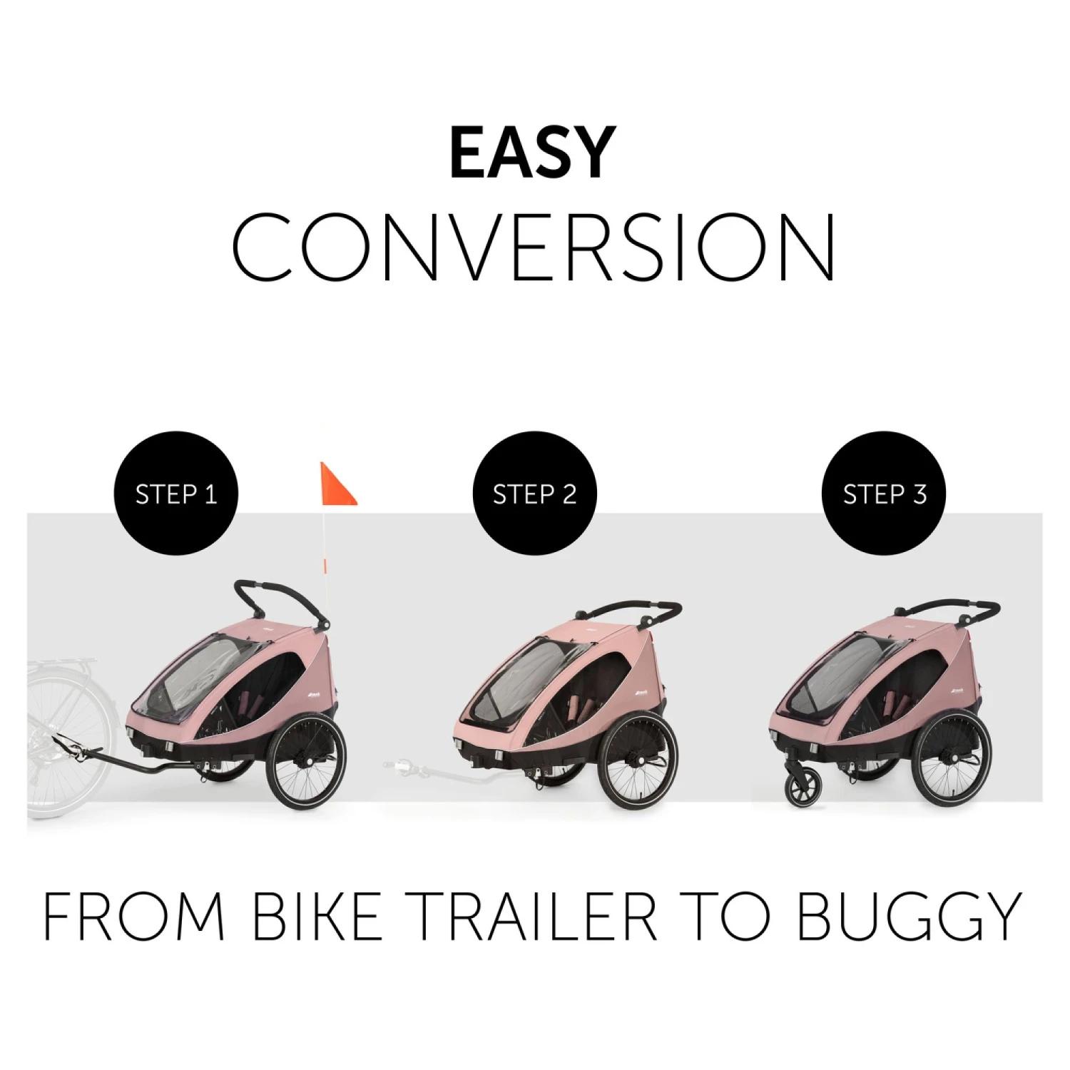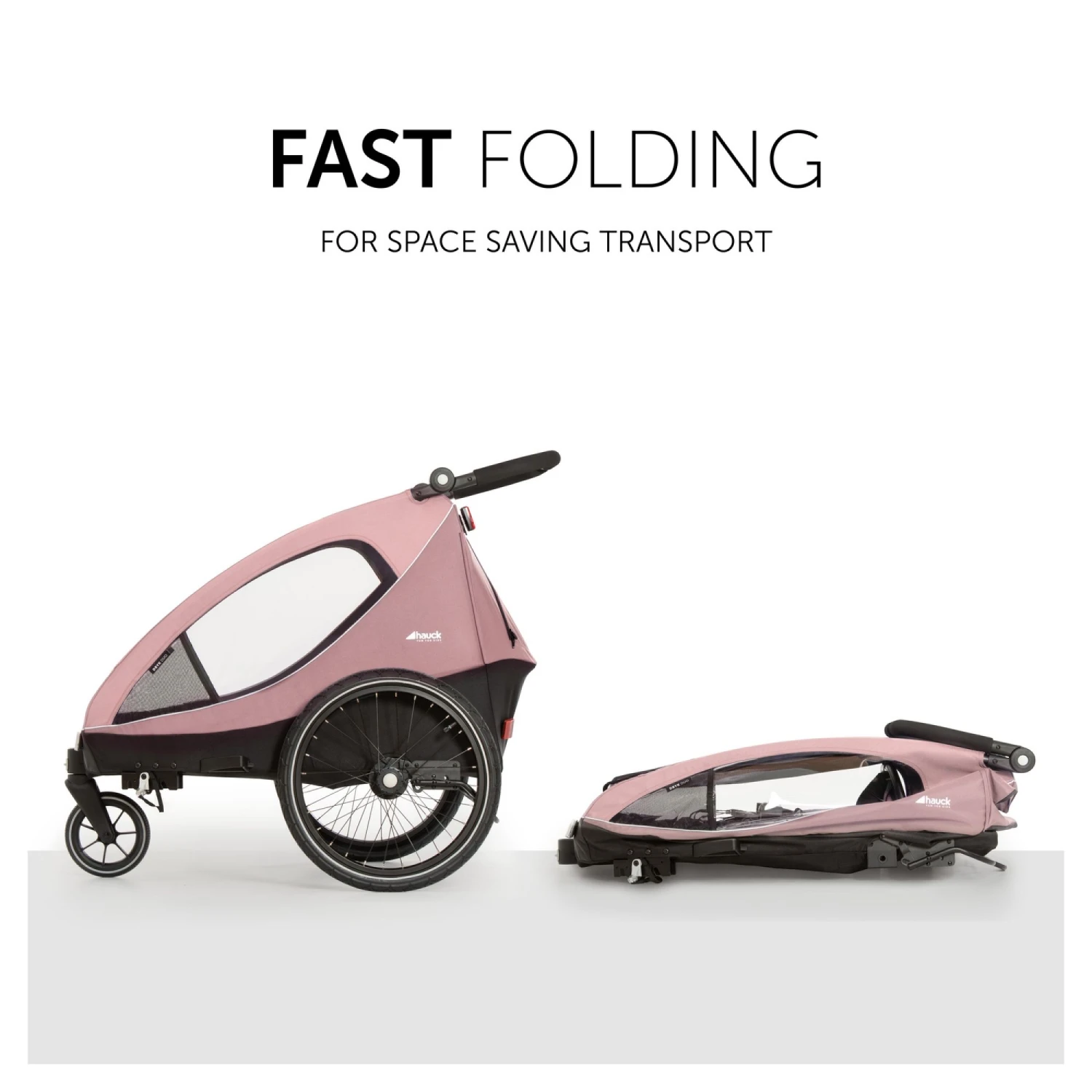 Découvrez le chariot Dryk Duo coloris rose de la marque Hauck. C’est la remorque idéale pour les promenades avec 1 ou 2 enfants. Vous pourrez le fixer à votre vélo pour vous déplacer en famille ou transformer le chariot en poussette. Le pliage est intuitif et facile.