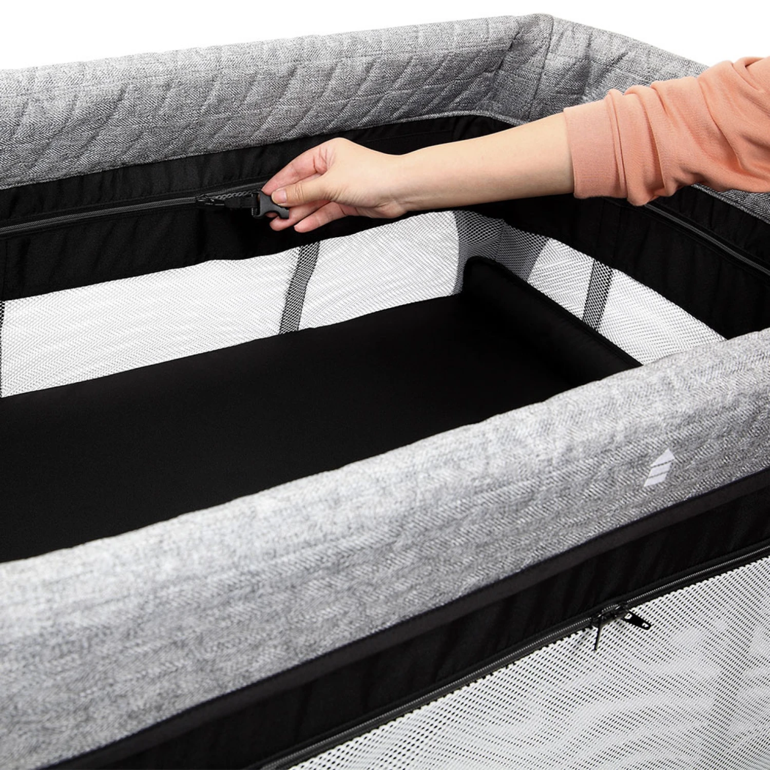 Le lit nomade à de multiples usages, il peut servir de parc de jeu la journée grâce à son amusante porte zippée et de lit douillet le soir ou pendant les siestes. Le lit évolutif offre 2 positions de couchage : avec ou sans le bassinet, qui se retire très simplement grâce à un zip. Avec le bassinet, vous n’aurez plus besoin de vous plier le dos pour sortir votre bébé du lit ! Le lit Fovea est équipé d’un matelas spécifique suffisamment rigide avec une couche d’accueil moelleuse qui assure le soutien du dos et le confort du petit dormeur. Pratique, ce matelas unique s’adapte au bassinet ou au sommier en position basse. Vous apprécierez le dépliage et le pliage simples et rapides qui ne nécessitent ni outils ni le démontage des pieds du lit. On peut même plier le lit nomade Fovea sans avoir à retirer le bassinet s’il est installé ! Enfin, le pliage s’effectue en “mode valise” et le lit bébé se glisse simplement dans son sac de transport muni de 2 poignées et d’une grande ouverture zippée.
