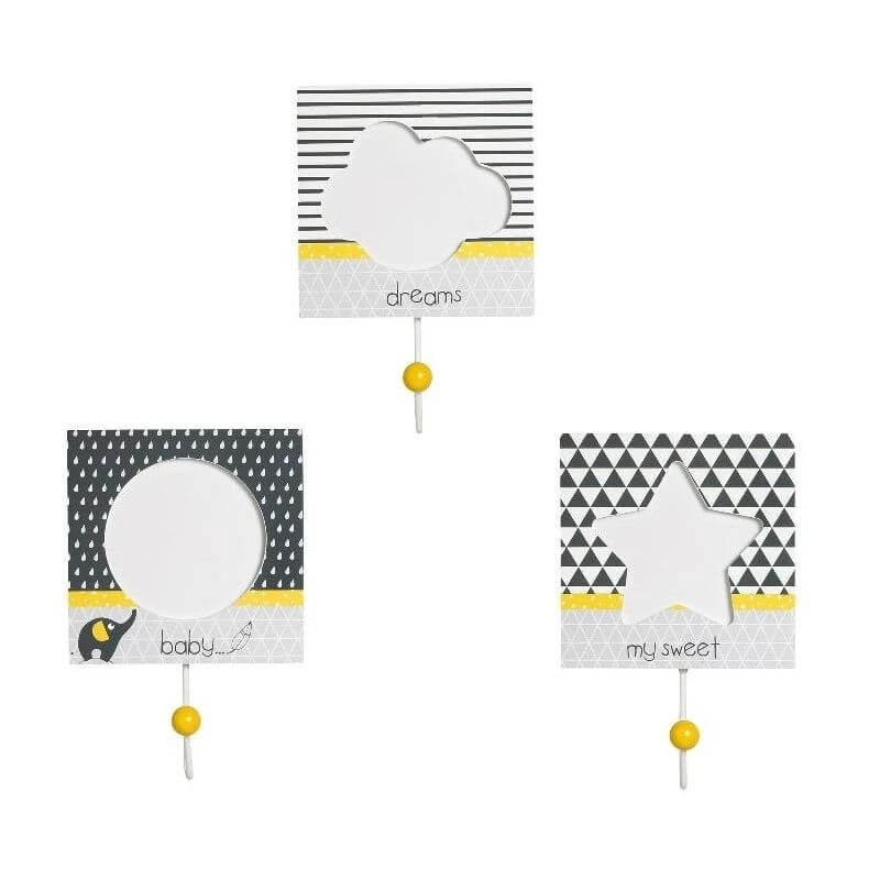 Découvrez ce lot de 3 patères de la collection Babyfan de la marque Sauthon Baby Déco. Ces adorables porte-manteaux s’accroche directement au mur. Votre petit bout pourra suspendre ses affaires les plus précieuses et même insérer des photos ou images.