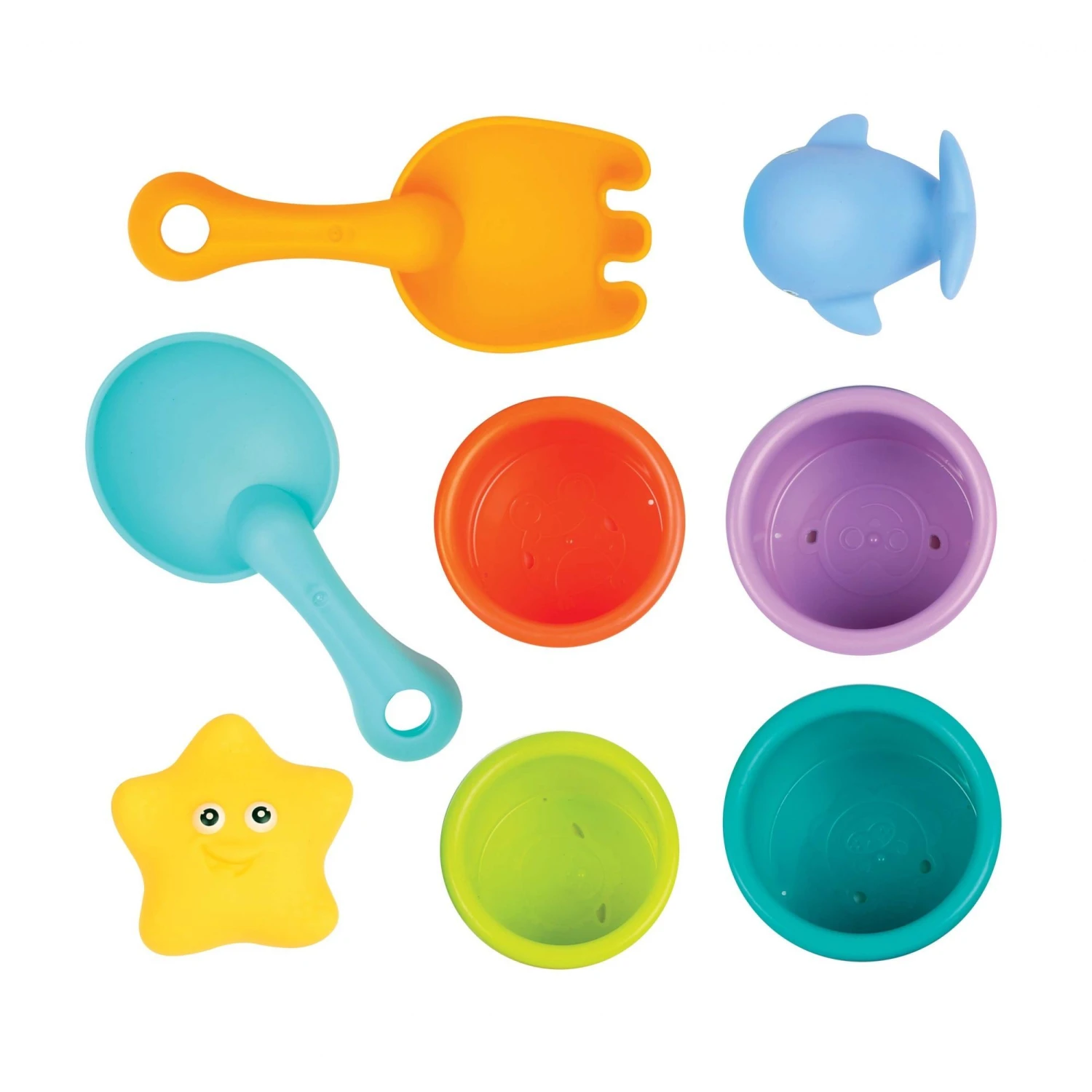 - 9 jouets inclus (un râteau, une pelle, une épuisette, 2 aspergeurs et 4 moules perforés)